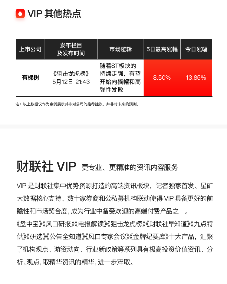 注:财联社VIP为内容资讯产品,并非投资建议。以下内容仅为资讯价值展示非对相关公司的推荐建议,非未来走势预测。投资有风险,入市需谨慎。
