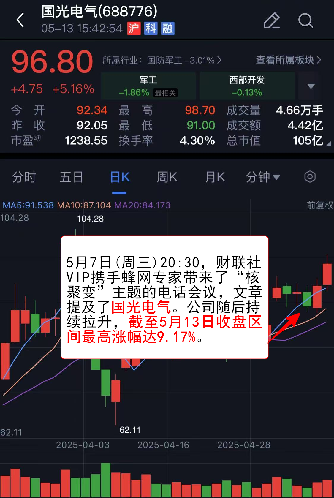 5月7日(周三)20:30,财联社VIP携手蜂网专家带来了“核聚变”主题的电话会议,据专家观点:在核聚变产业链中,以托卡马克为例,高温超导磁体系统占成本50%,主机三大件真空室、冷屏、镀瓦,加起来有百分之十几的占比,土建厂房大概占百分之十几,辅助系统、电源、仪器和控制电源大概占10%左右,仪器和控制(整个中央控制系统),大概占5%-6%左右,冷却系统大概占5%左右。其中BEST真空室由合锻智能承接,偏滤器供应商包括国光电气、安泰科技、雷福鑫。国光电气随后持续拉升,截至5月13日收盘区间最高涨幅达9.17%。