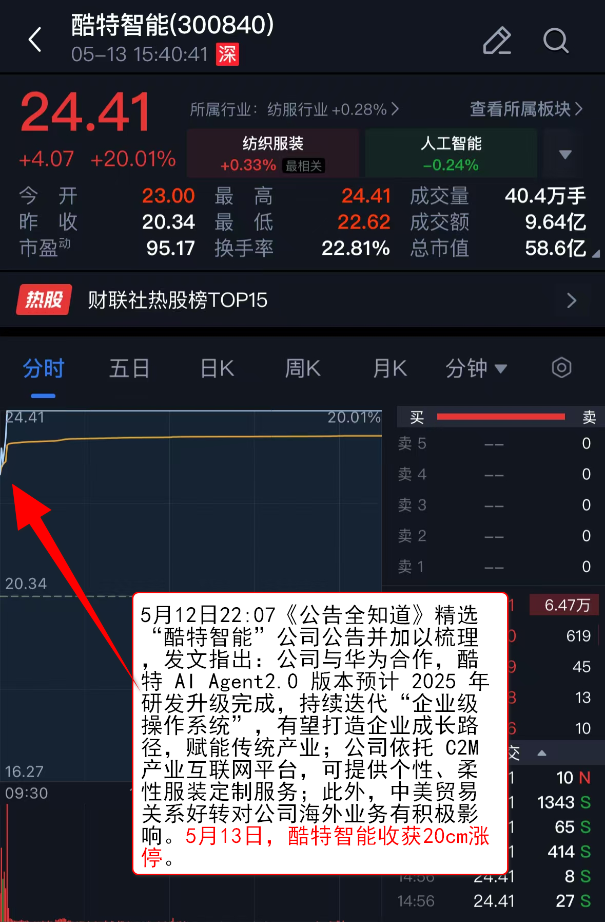 5月12日22:07《公告全知道》精选“酷特智能”公司公告并加以梳理,发文指出:公司与华为合作,酷特 AI Agent2.0 版本预计 2025 年研发升级完成,持续迭代“企业级操作系统”,有望打造企业成长路径,赋能传统产业;公司依托 C2M 产业互联网平台,可提供个性、柔性服装定制服务;此外,中美贸易关系好转对公司海外业务有积极影响。5月13日,酷特智能收获20cm涨停。