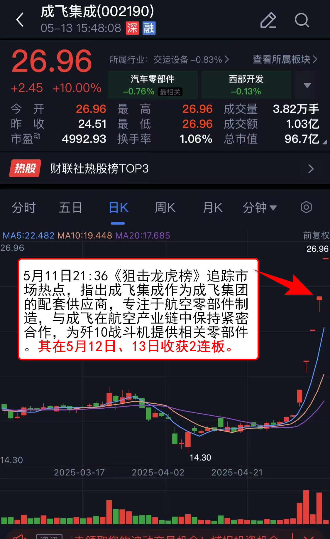 5月11日21:36《狙击龙虎榜》追踪市场热点,指出成飞集成作为成飞集团的配套供应商,专注于航空零部件制造,与成飞在航空产业链中保持紧密合作,为歼10战斗机提供相关零部件。其在5月12日、13日收获2连板。