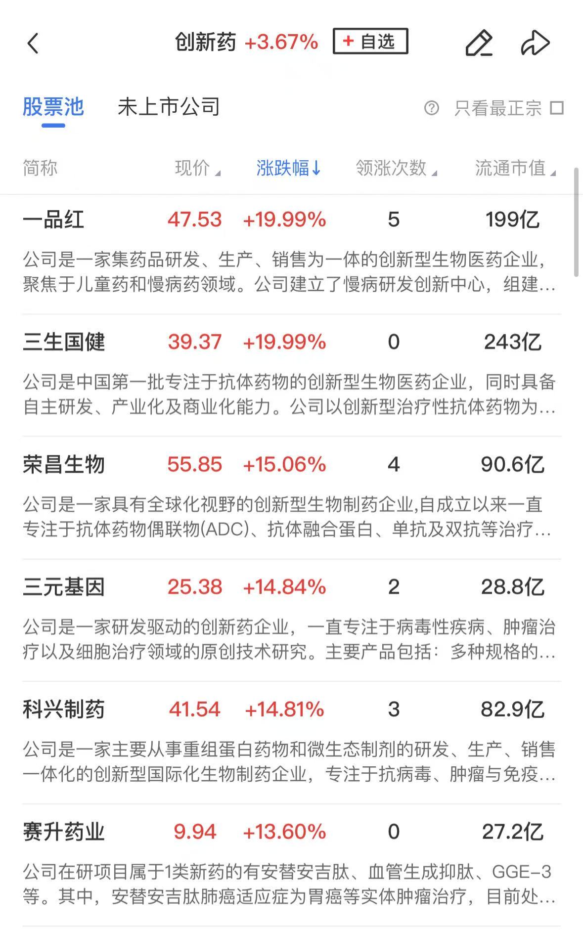 创新药概念股也于盘中活跃,一品红、亚泰集团、华海药业、未名医药涨停,荣昌生物、科兴制药、赛升药业等涨超10%。