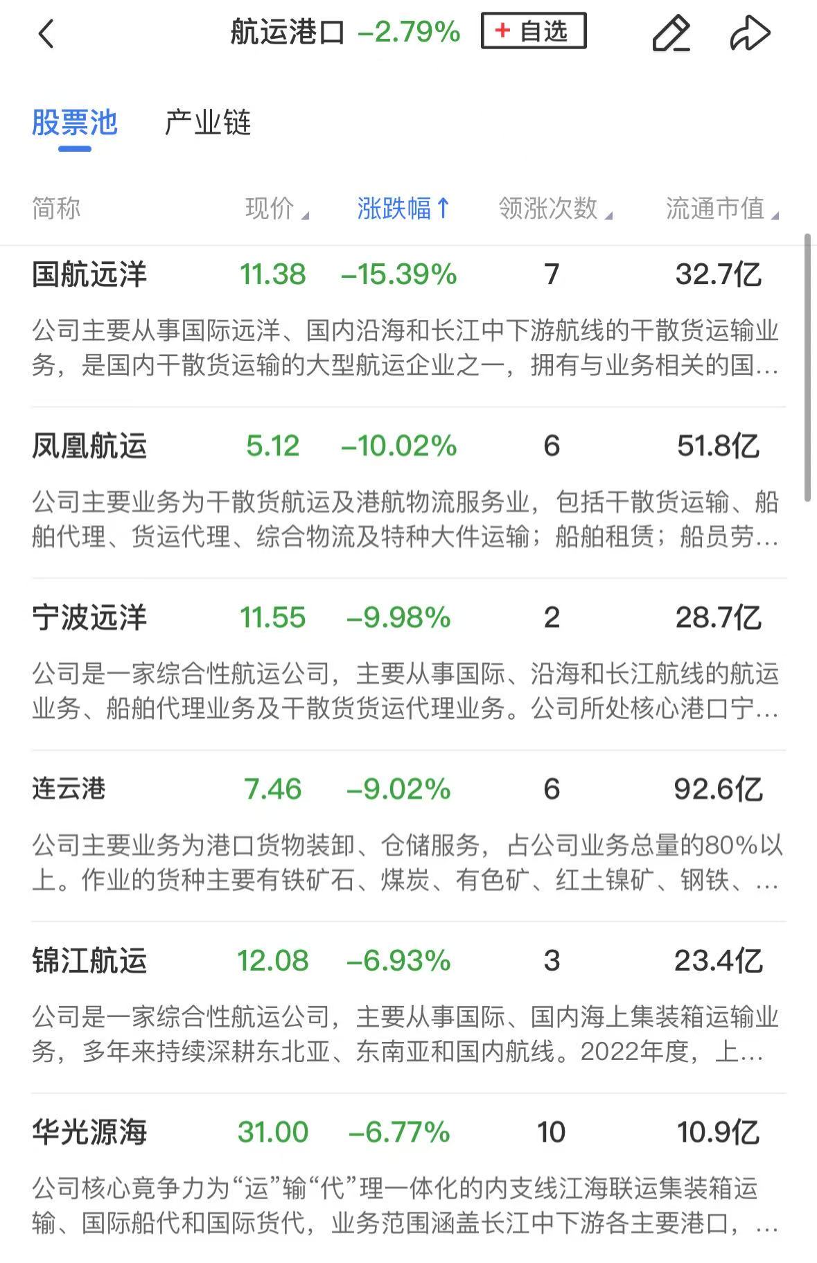港口航运板块跌幅居前,凤凰航运、宁波远洋跌停,连云港、锦江航运、宁波港、盐田港跌超5%。