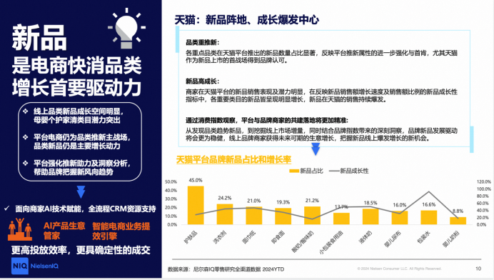报告显示,新品是电商快消品类增长的首要驱动力。天猫平台作为新品头部阵地和成长爆发中心,其新品销售表现及潜力尤为显著。尼尔森IQ零售研究全渠道数据显示,新品在电商快消品类中的占比和增长率均表现突出。2024年,天猫平台的新品占比和成长性指标均显示出强劲的增长潜力。