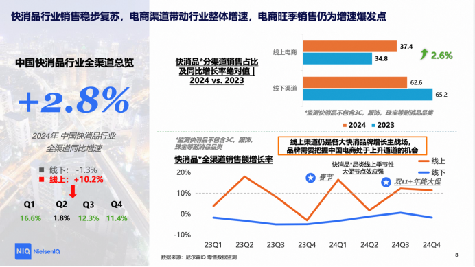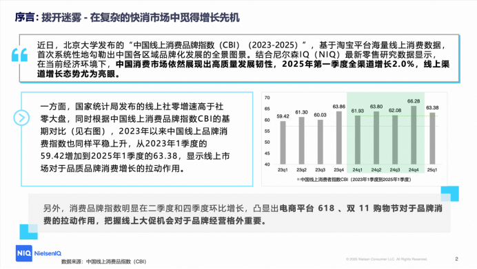 对此,尼尔森IQ指出,这与其监测的数据同样相互印证,从尼尔森IQ监测的销售数据看,在当前经济环境下,中国消费市场展现出强劲的发展韧性,电商平台在推动品牌化消费中发挥了关键作用。电商旺季销售仍为增速爆发点。同时,中国线上消费品牌指数(CBI)在二季度和四季度环比显著增长,进一步凸显出电商平台618、双11购物节对品牌消费的拉动作用。因此,把握线上大促的机会对于品牌经营来说至关重要。