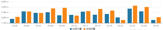 从趋势上来看,今年前五个月城投债融资只有2月呈净流入。4月城投债融资缺口扩大,当月城投债发行3530.05亿元,净偿还900.40亿元。目前,2025年城投债共发行1.46万亿元,同比下降14%;净偿还2200多亿元,融资缺口扩大了16%。