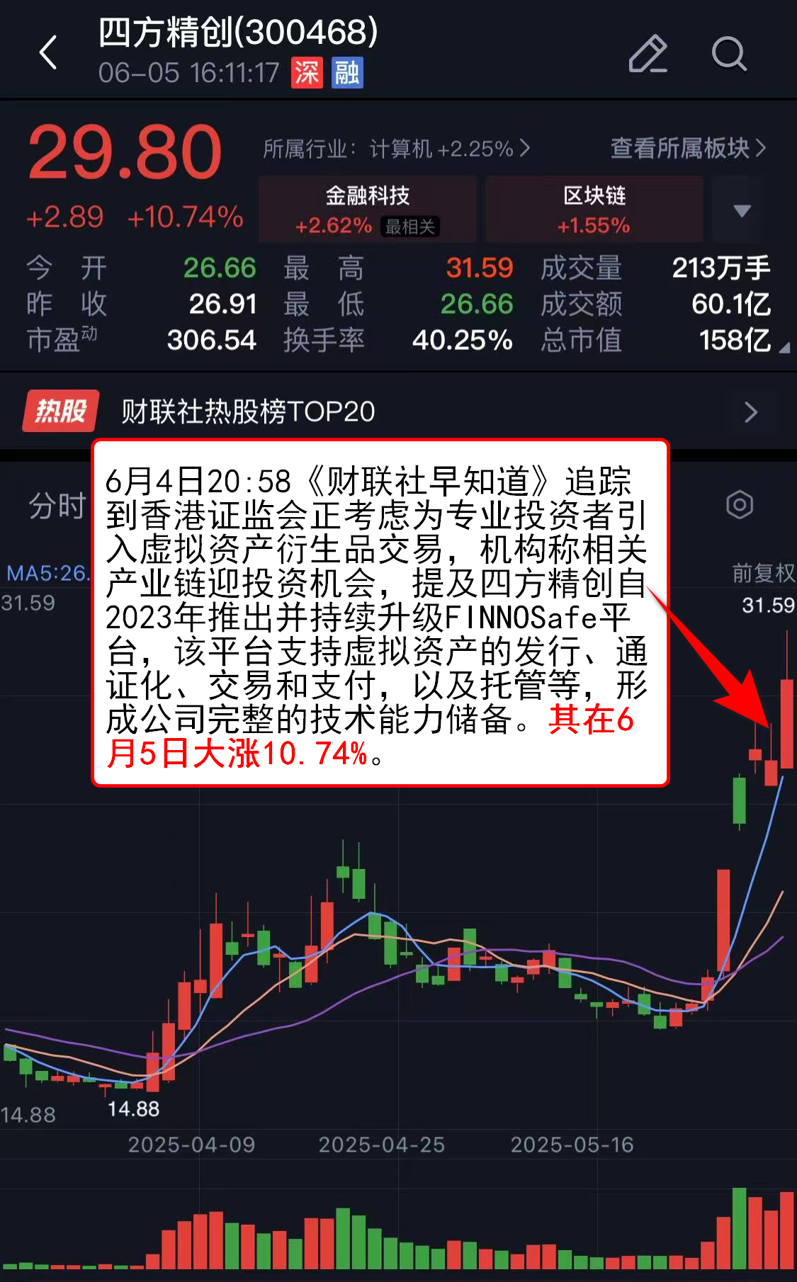 6月4日20:58《财联社早知道》追踪到香港证监会正考虑为专业投资者引入虚拟资产衍生品交易,机构称相关产业链迎投资机会,提及四方精创自2023年推出并持续升级FINNOSafe平台,该平台支持虚拟资产的发行、通证化、交易和支付,以及托管等,形成公司完整的技术能力储备。其在6月5日大涨10.74%。