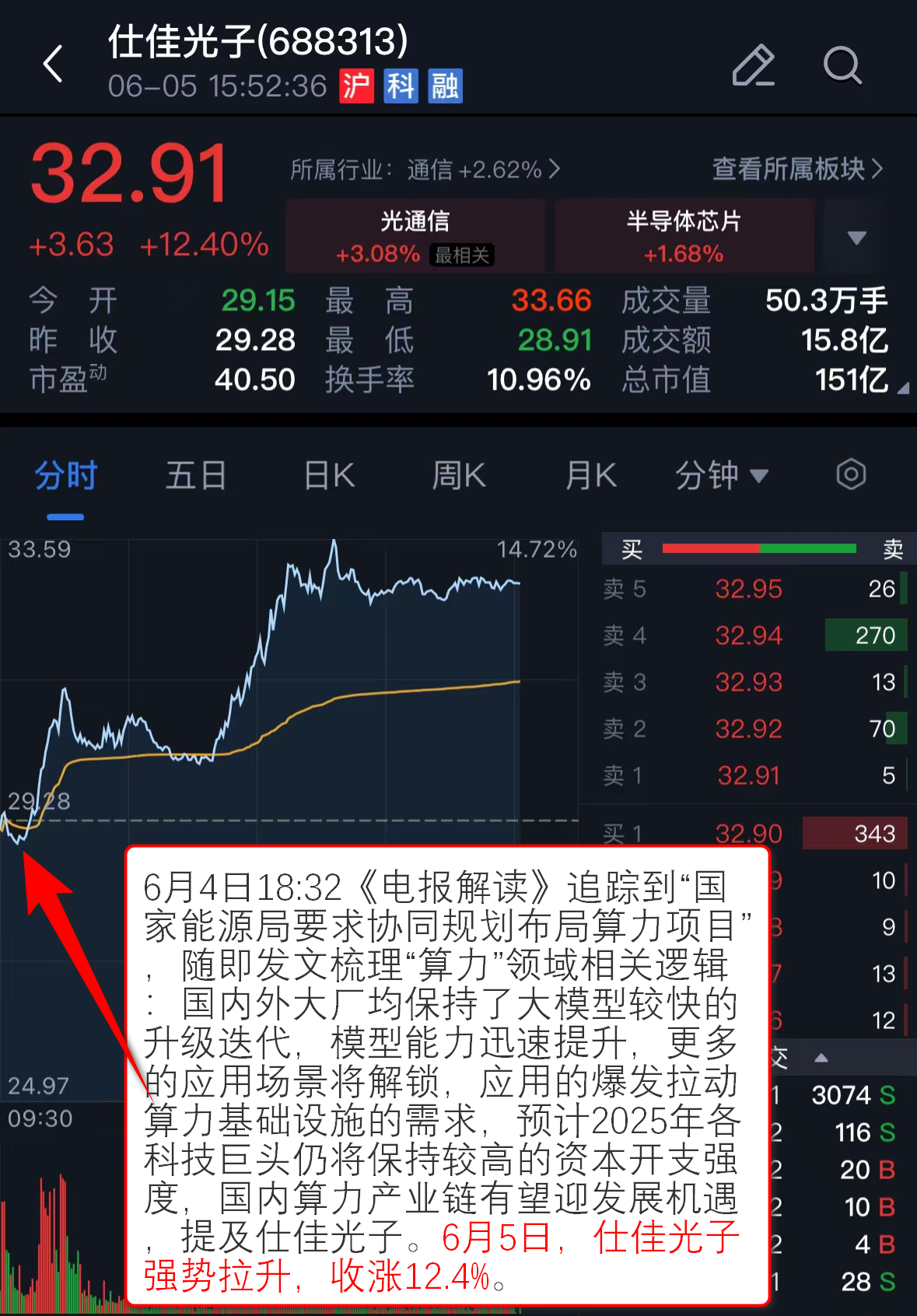 6月4日18:32《电报解读》追踪到“国家能源局要求协同规划布局算力项目”,随即发文梳理“算力”领域相关逻辑:国内外大厂均保持了大模型较快的升级迭代,模型能力迅速提升,更多的应用场景将解锁,应用的爆发拉动算力基础设施的需求,预计2025年各科技巨头仍将保持较高的资本开支强度,国内算力产业链有望迎发展机遇,提及仕佳光子。6月5日,仕佳光子强势拉升,收涨12.4%。