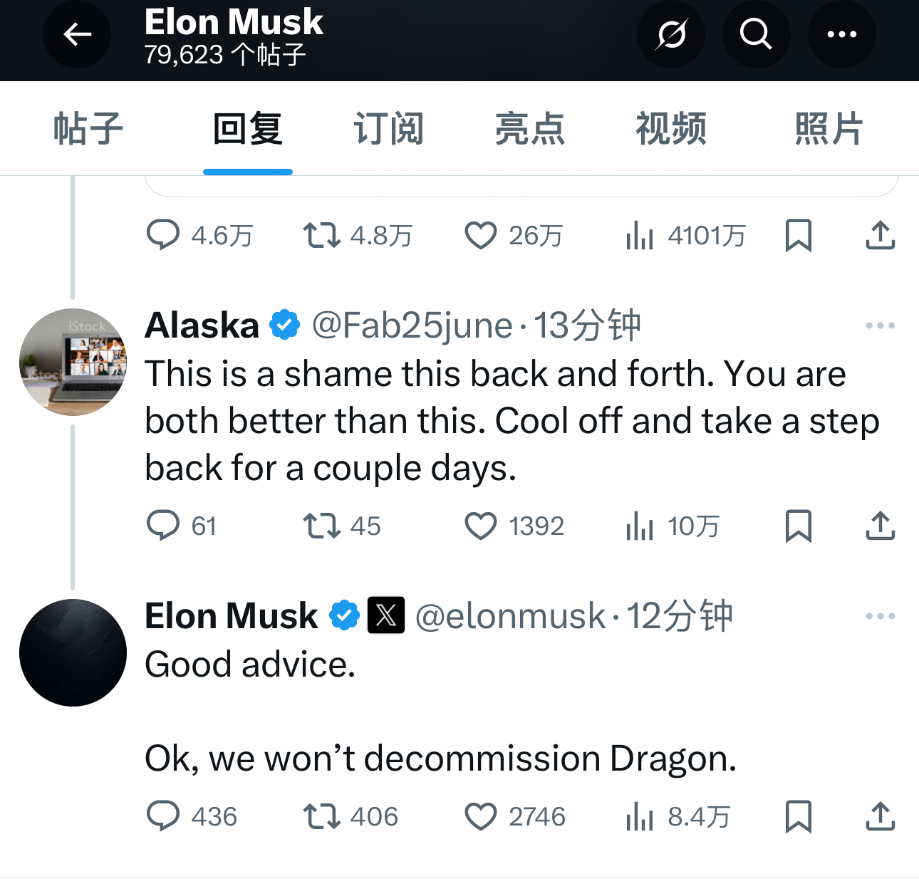 甚至,马斯克可能还觉得事情不够“热闹”,他后来还加大了赌注,写道:“鉴于总统关于取消我的政府合同的声明,SpaceX(美国太空探索技术公司)将立即开始退役其‘龙’飞船。”