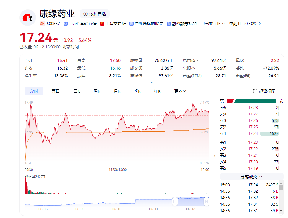 受板块带动,以康缘药业为代表的中成药上市公司,股价也节节攀高。其中,6月11日,康缘药业开盘即涨停,报收16.32元/股;6月12日收盘再次大涨5.64%,报收17.24元/股。
