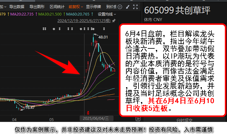 6月4日盘前,栏目解读龙头板块新消费,指出今年端午恰逢六一,双节叠加带动假日消费热。以IP潮玩为代表的产业本质消费的是符号与内容价值,而像古法金满足年轻消费者审美及保值需求,引领行业发展新趋势,机构看好当下情绪价值与体验消费切中需求痛点,正在快速兑现商业价值,传统需求迎来新供给,并提及当时足球概念公司共创草坪,其在6月4日至6月10日收获5连板。