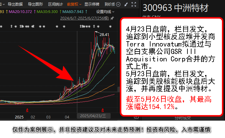 4月23日盘前,栏目发文,追踪到小型核反应堆开发商Terra Innovatum拟通过与空白支票公司GSR III Acquisition Corp合并的方式上市,指出作为全球能源共振重点方向,小型核反应堆产业化进程加速,并提及上市公司中州特材。