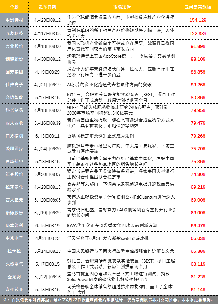 其中中洲特材、九菱科技更是在栏目梳理后最高涨超100%,而中洲特材以154.12%的涨幅登顶栏目梳理个股涨幅榜。附上二季度里,自发布起,截至2025年6月27日收盘,栏目梳理区间涨幅超60%的大涨股:
