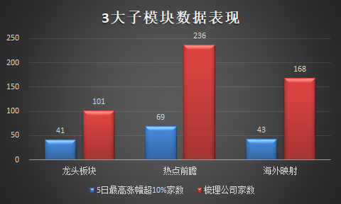再来看栏目的三大子模块【龙头板块】【热点前瞻】【海外映射】的具体表现,其中,【海外映射】梳理了168家上市公司,其中43次梳理后5日最高涨幅超10%,占比达25.6%;【龙头板块】梳理了101家上市公司,其中41次梳理后5日最高涨幅超10%,占比达40.6%;【热点前瞻】梳理了236家上市公司,其中69次梳理后5日最高涨幅超10%,占比达29.2%。