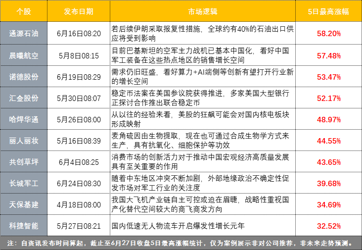 从2025年4月1日起至2025年6月27日共59个交易日中,《九点特供》栏目从解读影响盘面的大政策、透视板块龙头、前瞻题材热点中浓缩成59篇高度解析市场动向的文章,共梳理了505次共计414只个股,其中有多只热门重点个股持续追踪,多次梳理。以栏目资讯发布时间为起始价,截至6月27日收盘,从股价表现来看,有38家公司梳理后最高涨幅超50%;7家最高涨幅超80%。
