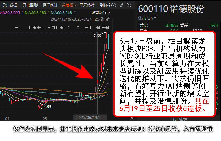 6月19日盘前,栏目解读龙头板块PCB,指出机构认为PCB/CCL行业兼具周期和成长属性,当前AI算力在大模型训练以及AI应用持续优化迭代的推动下,需求仍旧旺盛,看好算力+AI端侧等创新有望打开行业新的增长空间,并提及诺德股份。其在6月19日至25日收获5连板。