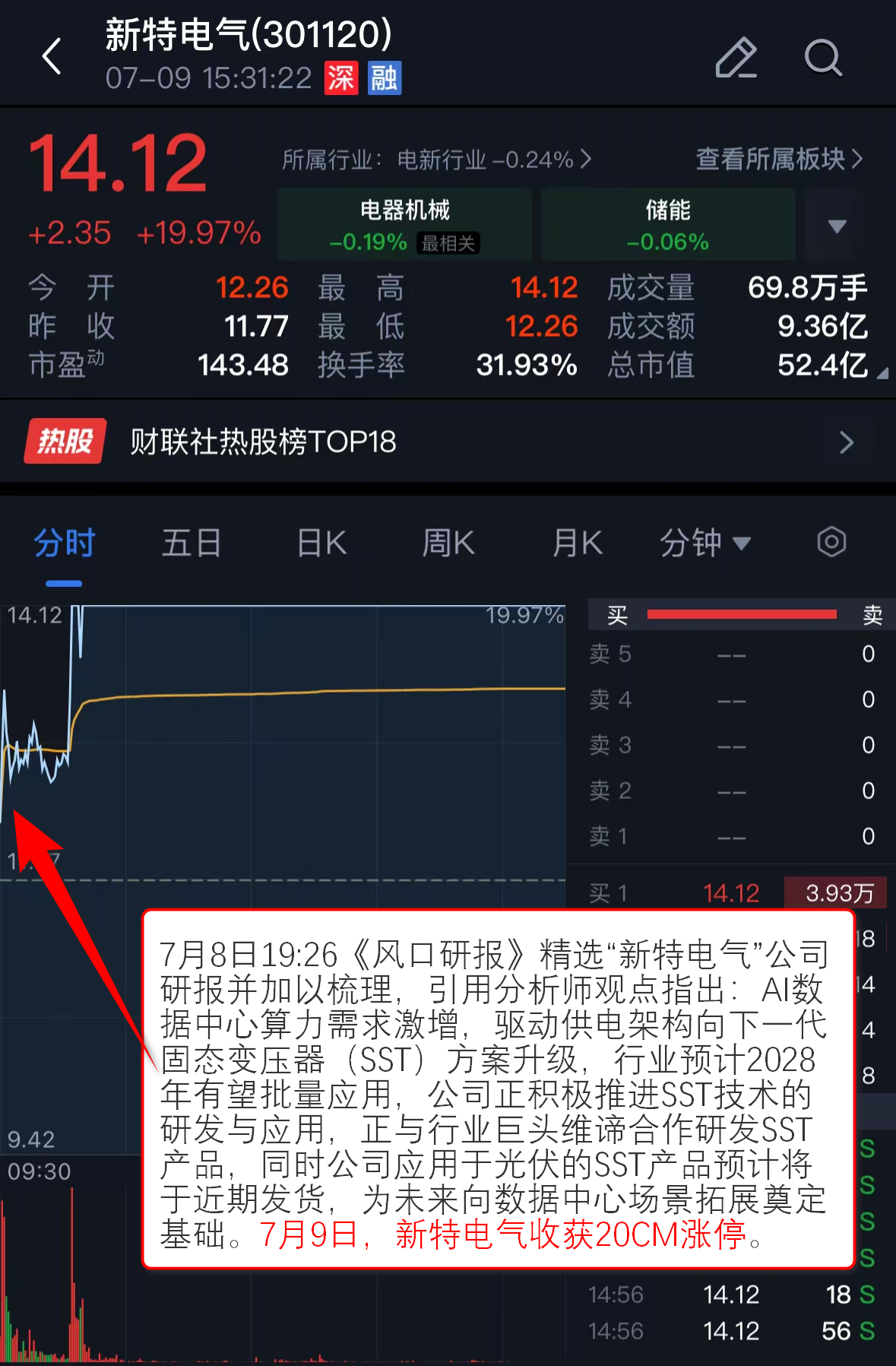 7月8日19:26《风口研报》精选“新特电气”公司研报并加以梳理,引用分析师观点指出:AI数据中心算力需求激增,驱动供电架构向下一代固态变压器(SST)方案升级,行业预计2028年有望批量应用,公司正积极推进SST技术的研发与应用,正与行业巨头维谛合作研发SST产品,同时公司应用于光伏的SST产品预计将于近期发货,为未来向数据中心场景拓展奠定基础。7月9日,新特电气收获20CM涨停。