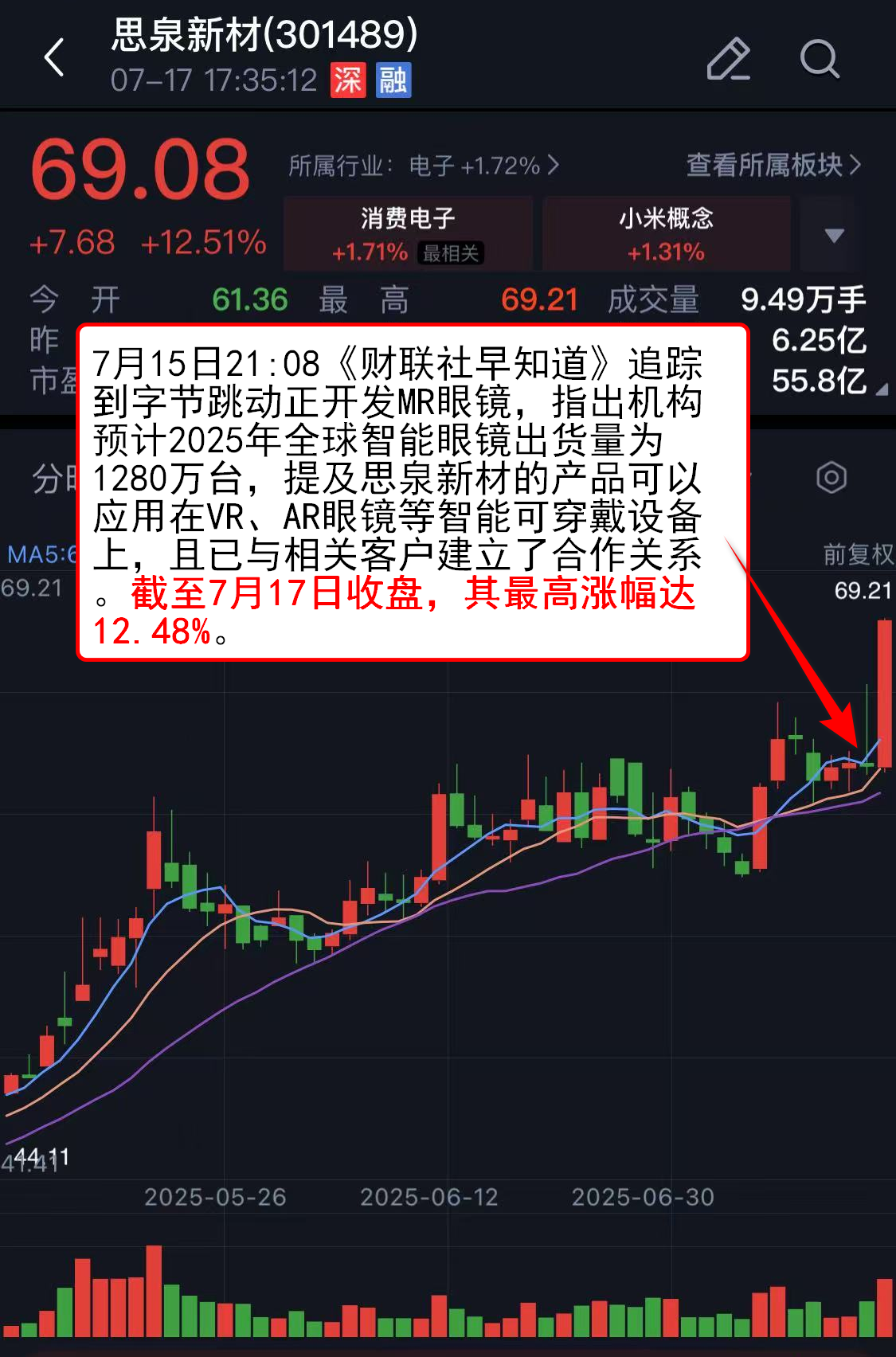 7月15日21:08《财联社早知道》追踪到字节跳动正开发MR眼镜,指出机构预计2025年全球智能眼镜出货量为1280万台,提及思泉新材的产品可以应用在VR、AR眼镜等智能可穿戴设备上,且已与相关客户建立了合作关系。截至7月17日收盘,其最高涨幅达12.48%。