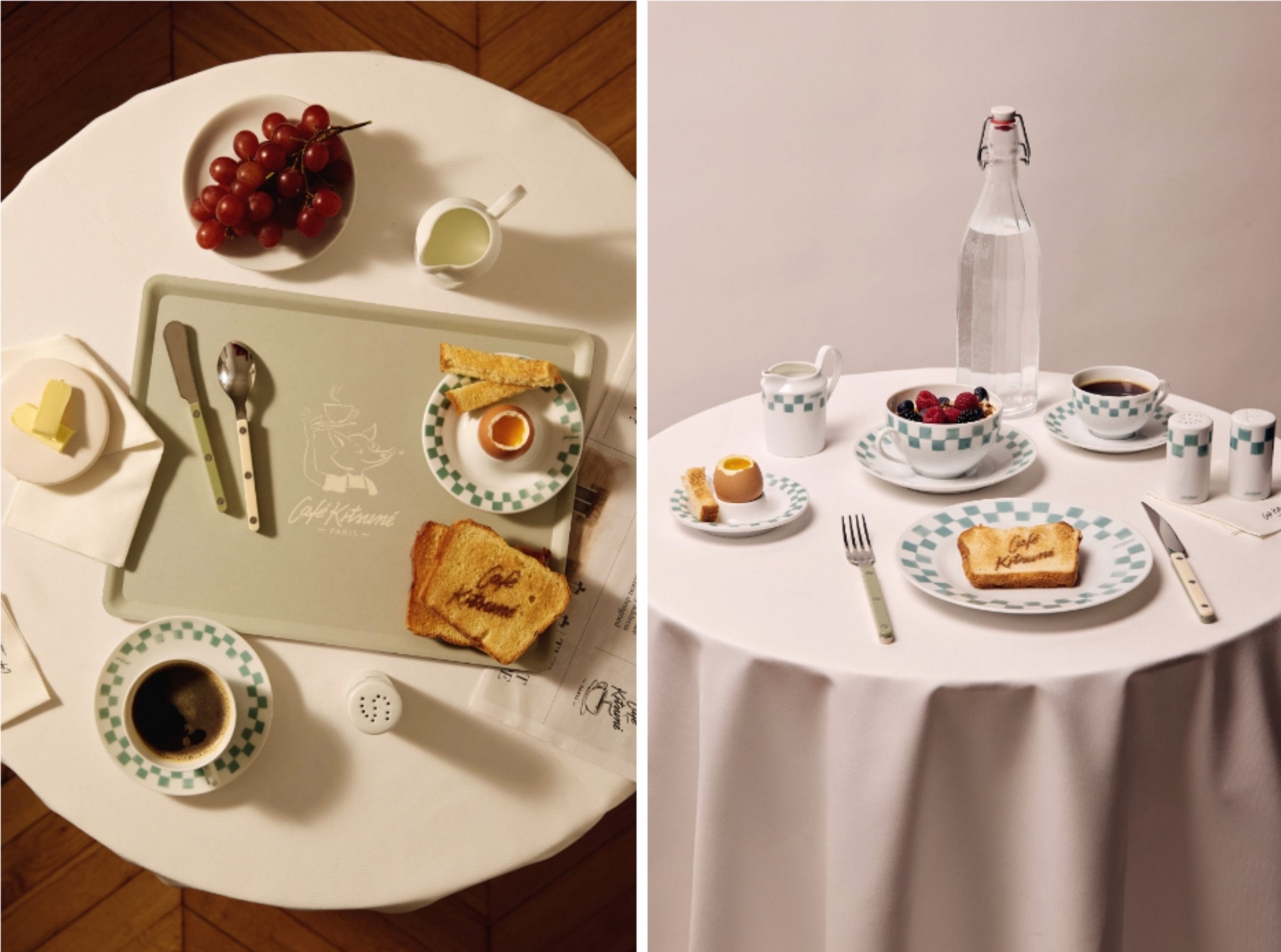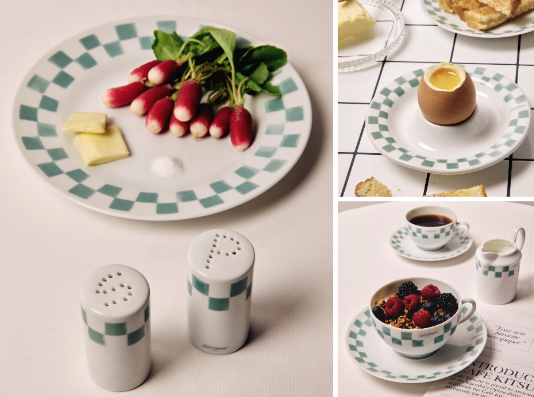 这一特别系列从清晨巴黎的优雅格调与东京周末早间的恬淡氛围中汲取灵感,诠释Café Kitsuné简约雅致且充满温情的艺术生活美学。该餐具系列以手工精心绘制的蓝绿水彩棋盘纹为视觉语言,细腻点缀于蛋杯、咖啡杯、碗碟、奶壶及胡椒盐瓶组之上,每件器物都足以点亮晨起的独特仪式感。