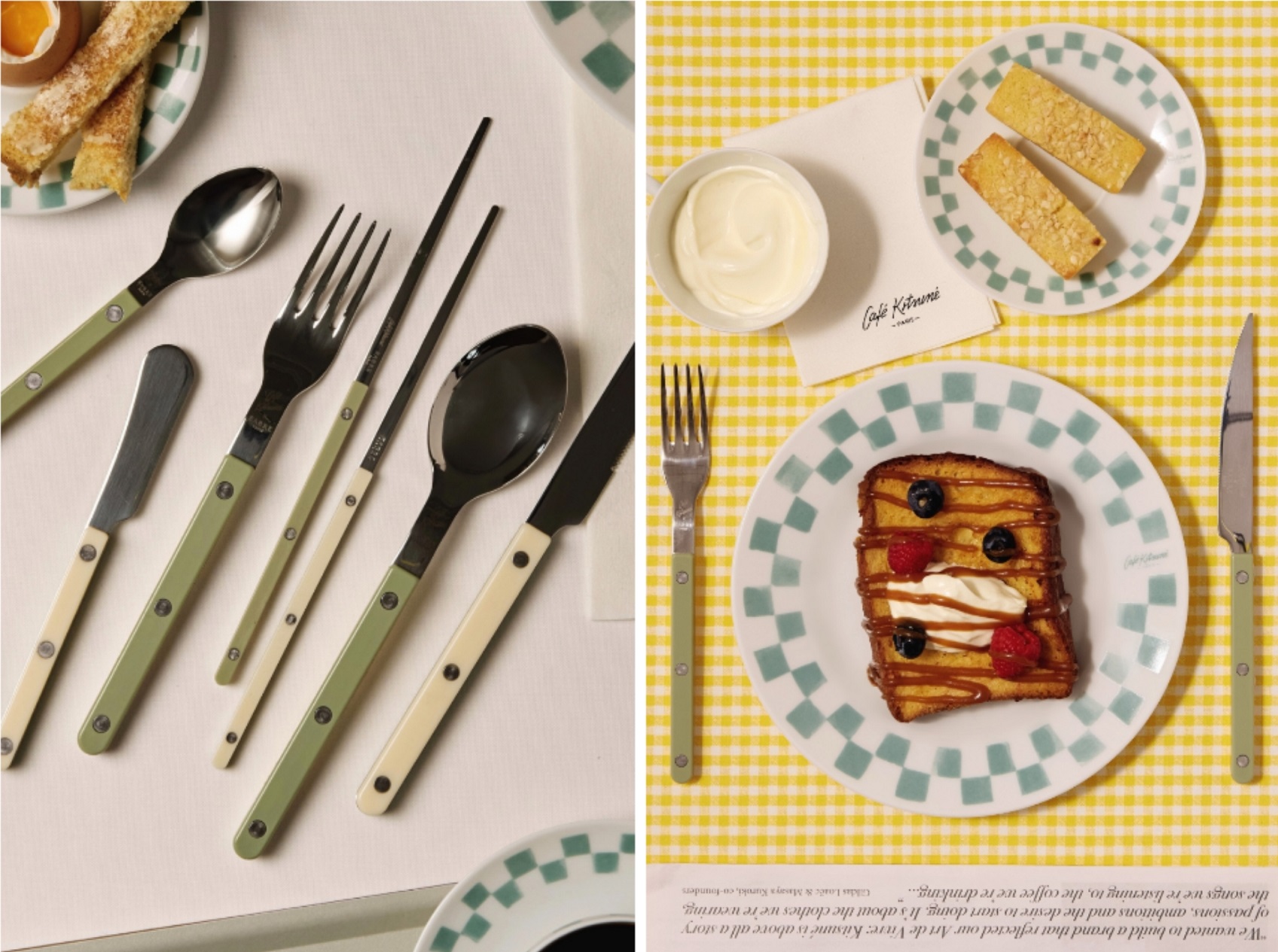 为完善构筑理想餐桌美学,Café Kitsuné此番亦首度联袂法国餐具品牌Sabre Paris,匠心打造独家不锈钢餐具系列。采用标志性抹茶绿与拿铁棕双色搭配,在金属光泽的映衬间演绎色彩对话。