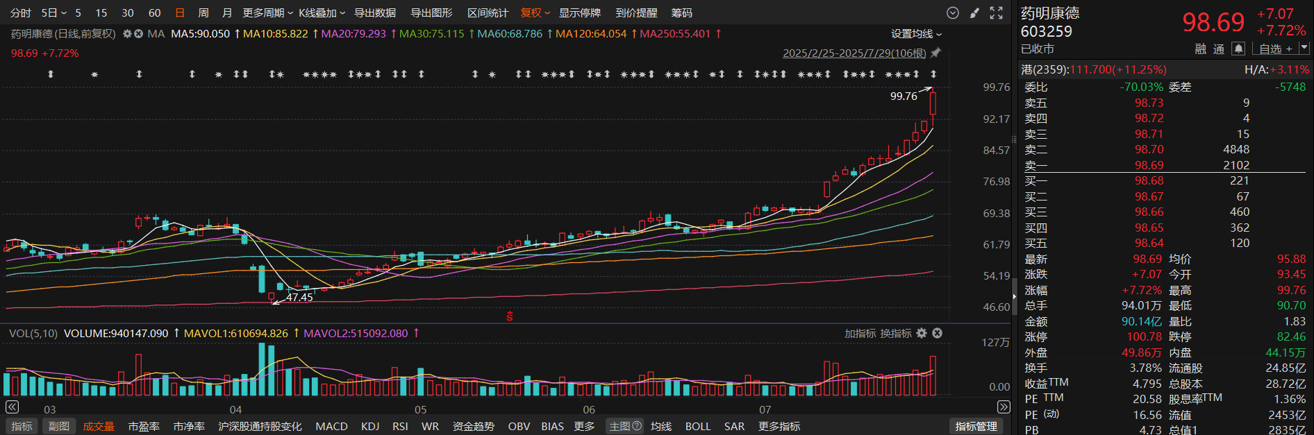 财联社7月29日电,药明康德(603259.SH)公告称,拟将2025年第一次以集中竞价交易方式回购A股股份的回购股份价格上限由不超过90.72元/股(含)调整为不超过114.15元/股,本次回购方案的其他内容不变。小财注:药明康德今日收盘价98.69元/股。