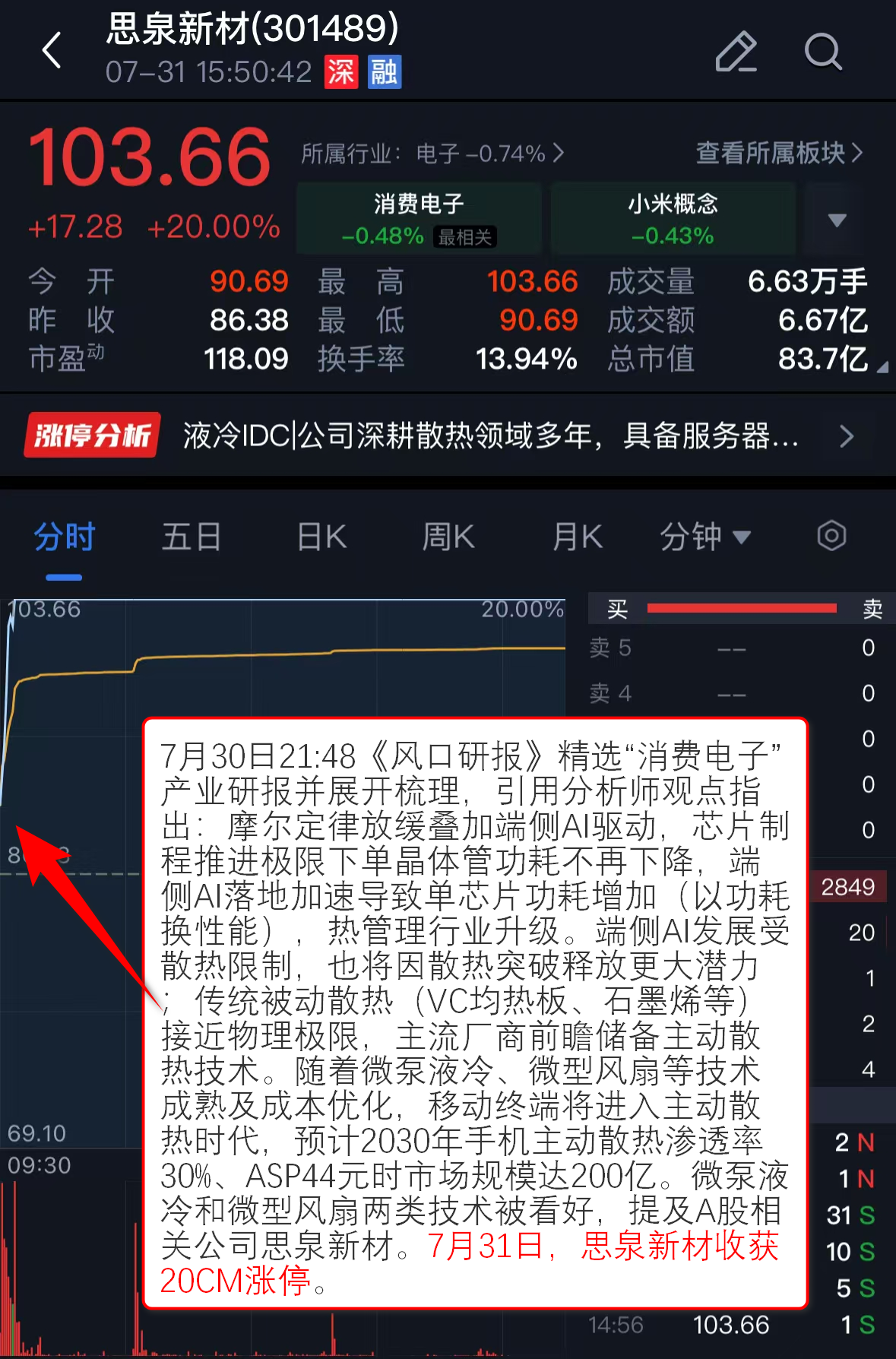 7月30日21:48《风口研报》精选“消费电子”产业研报并展开梳理,引用分析师观点指出:摩尔定律放缓叠加端侧AI驱动,芯片制程推进极限下单晶体管功耗不再下降,端侧AI落地加速导致单芯片功耗增加(以功耗换性能),热管理行业升级。端侧AI发展受散热限制,也将因散热突破释放更大潜力;传统被动散热(VC均热板、石墨烯等)接近物理极限,主流厂商前瞻储备主动散热技术。随着微泵液冷、微型风扇等技术成熟及成本优化,移动终端将进入主动散热时代,预计2030年手机主动散热渗透率30%、ASP44元时市场规模达200亿。微泵液冷和微型风扇两类技术被看好,提及A股相关公司思泉新材。7月31日,思泉新材收获20CM涨停。
