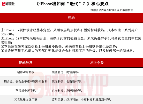 专家:在iPhone 16和17系列中,苹果在石墨烯散热膜领域的核心供应商基本保持不变,仍以原有的一级供应商为主。以中石科技,捷邦科技这两家为主。VC均热板引入瑞声科技和领益智造等,领益智造目前已成功开发出厚度小于0.25mm的超薄VC均热板。