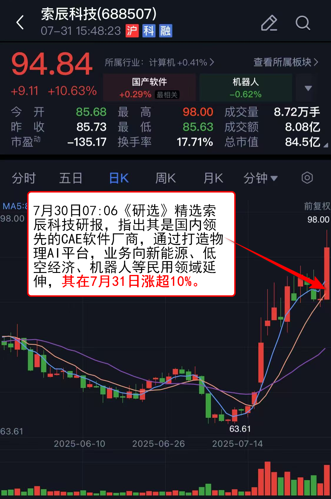 7月30日07:06《研选》精选索辰科技研报,指出其是国内领先的CAE软件厂商,通过打造物理AI平台,业务向新能源、低空经济、机器人等民用领域延伸,其在7月31日涨超10%。