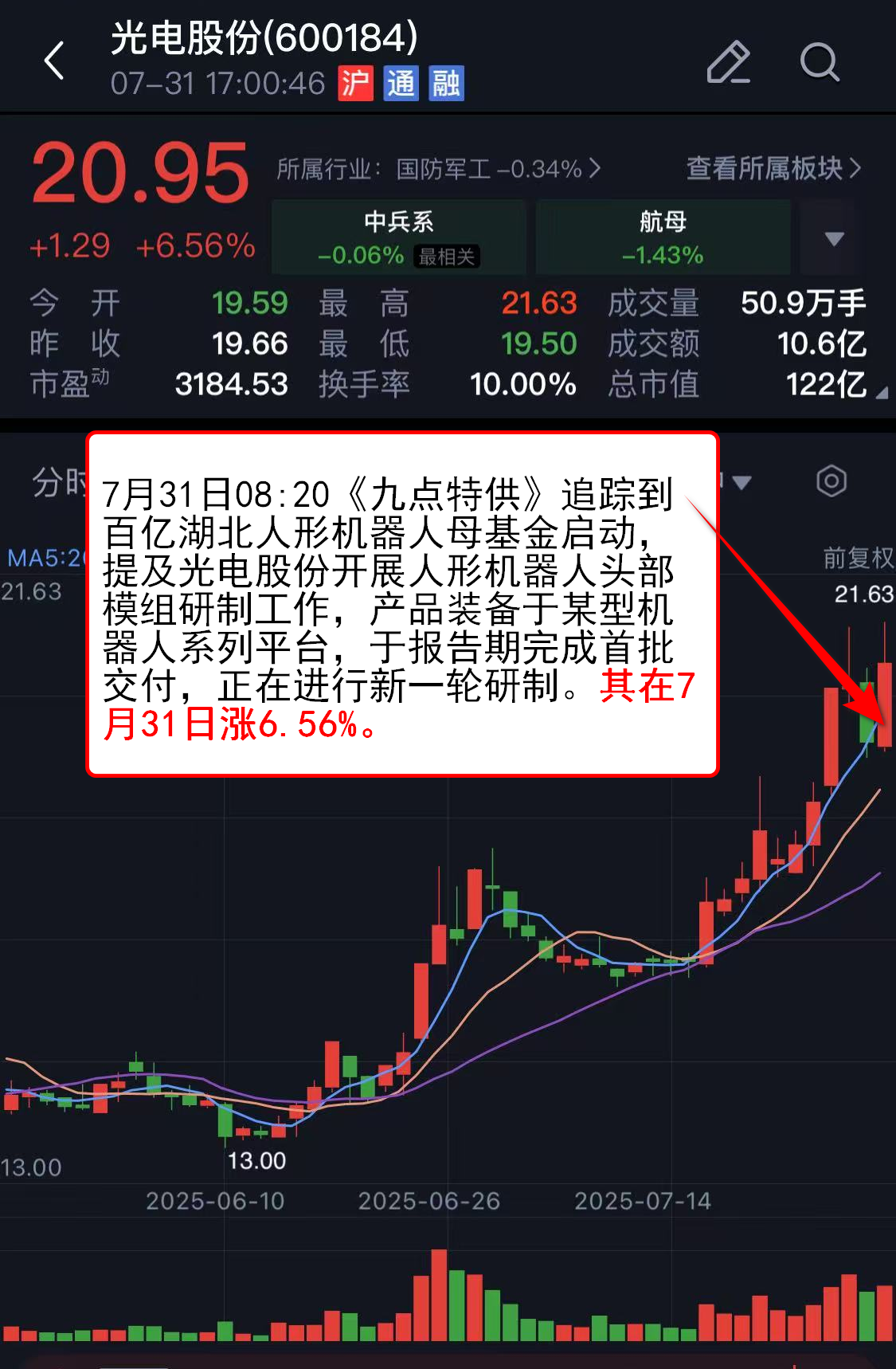 往期回顾:7月31日08:20《九点特供》追踪到百亿湖北人形机器人母基金启动,提及光电股份开展人形机器人头部模组研制工作,产品装备于某型机器人系列平台,于报告期完成首批交付,正在进行新一轮研制。其在7月31日涨6.56%。