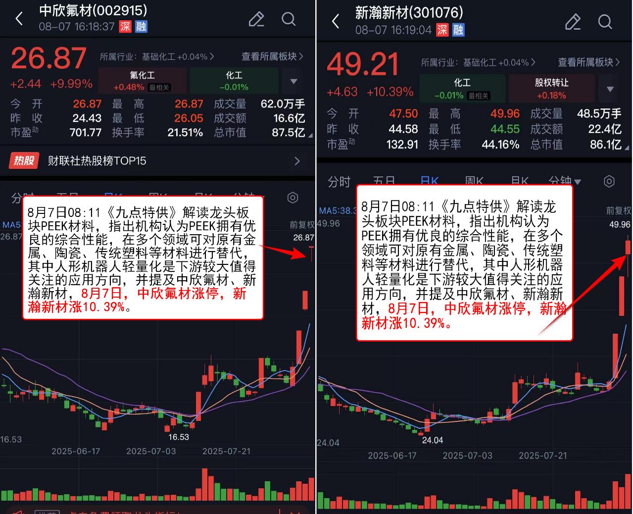 往期回顾:8月7日08:11《九点特供》解读龙头板块PEEK材料,指出机构认为PEEK拥有优良的综合性能,在多个领域可对原有金属、陶瓷、传统塑料等材料进行替代,其中人形机器人轻量化是下游较大值得关注的应用方向,并提及中欣氟材、新瀚新材,8月7日,中欣氟材涨停,新瀚新材涨10.39%。