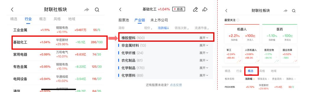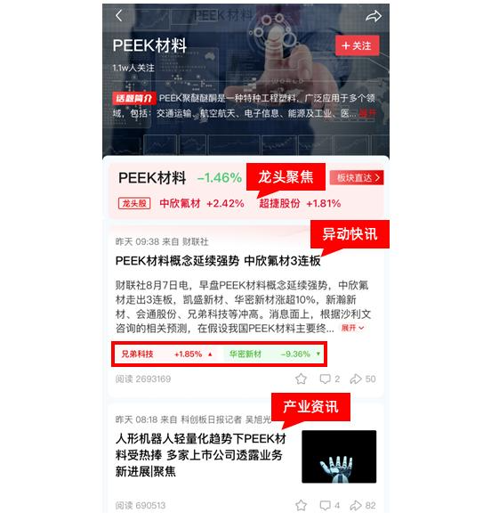 如近期爆火的PEEK材料概念多数投资者可能仅知其名,而通过「主题库」可一键理清:
