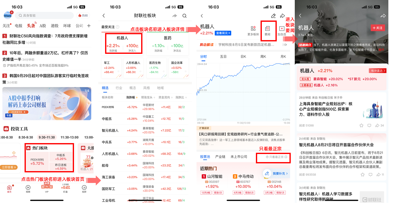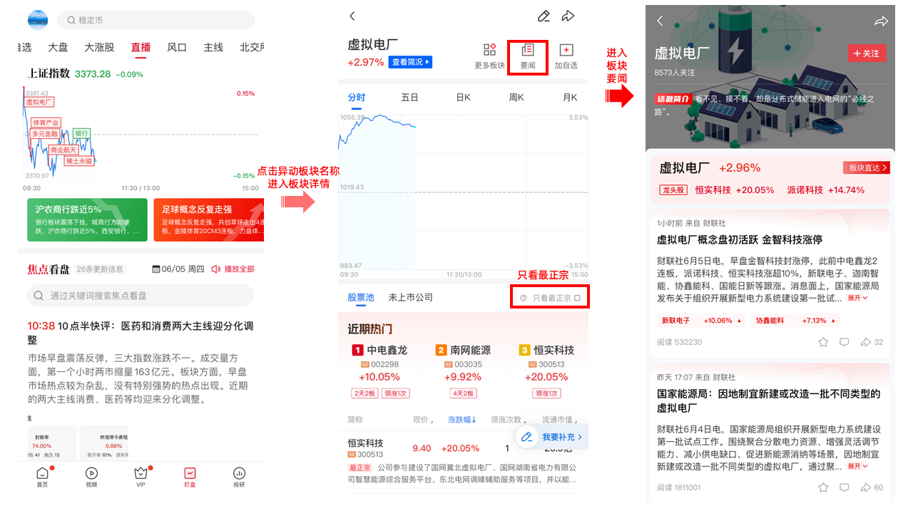 路径二(盯盘触发):在盯盘中各个模块点击任一板块进入到对应板块详情,以“直播”为例→点击“异动板块”进入该板块详情页→点击“要闻”获取更多资讯。