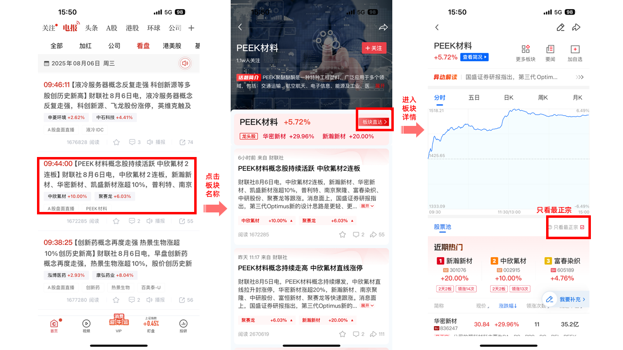 路径一(电报触发):在电报中刷到一则板块异动“快讯”→点击该电报底部“板块标签”→进入“板块要闻”→点击“板块直达”,即可查看完整信息。