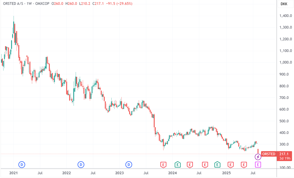 作为周一的最新挫折,海上风电巨头Orsted宣布计划进行最高600亿丹麦克朗(约合人民币671亿元)融资。受此冲击,股价单日创纪录暴跌29%,已经跌破其2016年上市时的发行价。