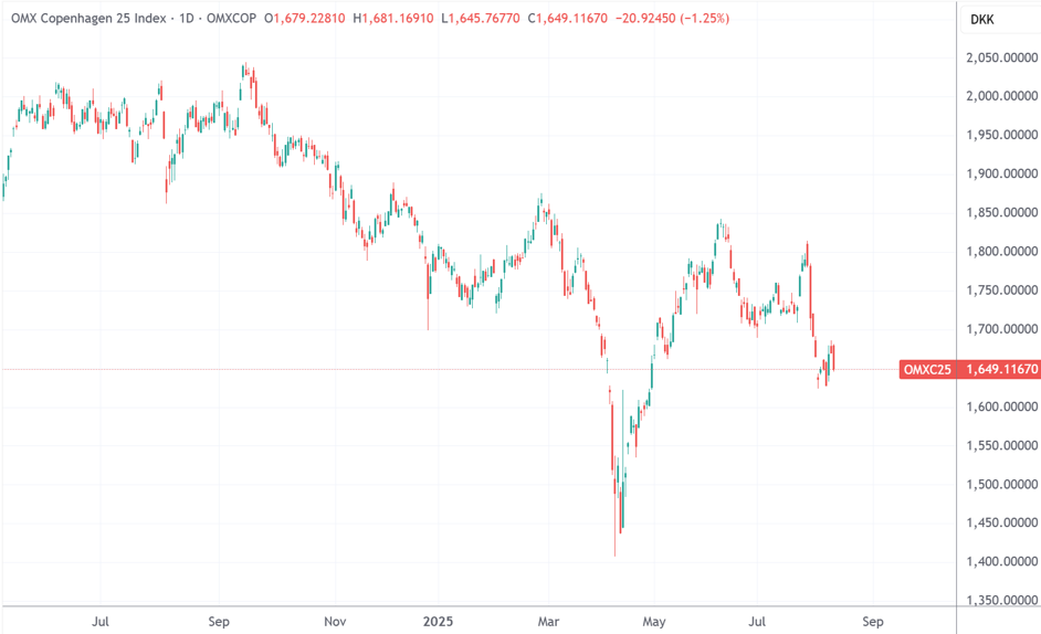 财联社8月12日讯(编辑 史正丞)截至周一收盘,涵盖25只丹麦市值最大股票的OMX哥本哈根25指数(OMXC25)年内累计下跌达7.5%,从近一年内高点的累计跌幅更是达到20%。