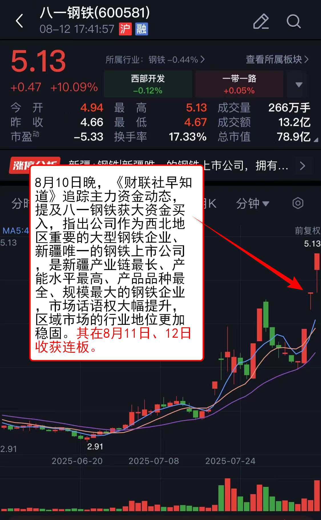 8月10日晚,《财联社早知道》追踪主力资金动态,提及八一钢铁获大资金买入,指出公司作为西北地区重要的大型钢铁企业、新疆唯一的钢铁上市公司,是新疆产业链最长、产能水平最高、产品品种最全、规模最大的钢铁企业,市场话语权大幅提升,区域市场的行业地位更加稳固。其在8月11日、12日收获连板。