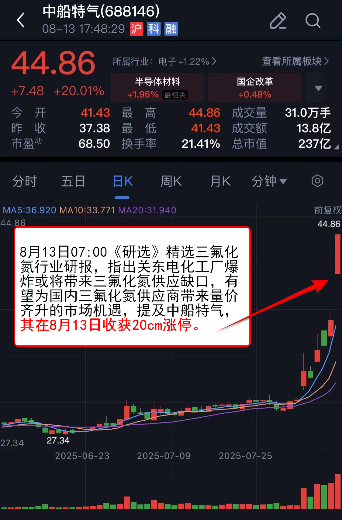 8月13日07:00《研选》精选三氟化氮行业研报,指出关东电化工厂爆炸或将带来三氟化氮供应缺口,有望为国内三氟化氮供应商带来量价齐升的市场机遇,提及中船特气,其在8月13日收获20cm涨停。