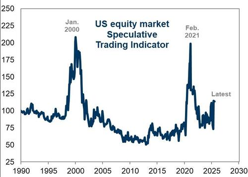 高盛编制的投机交易指数(Speculative Trading Indicator)的最新读数目前已升至了114,这表明由散户主导的投机交易持续上升。