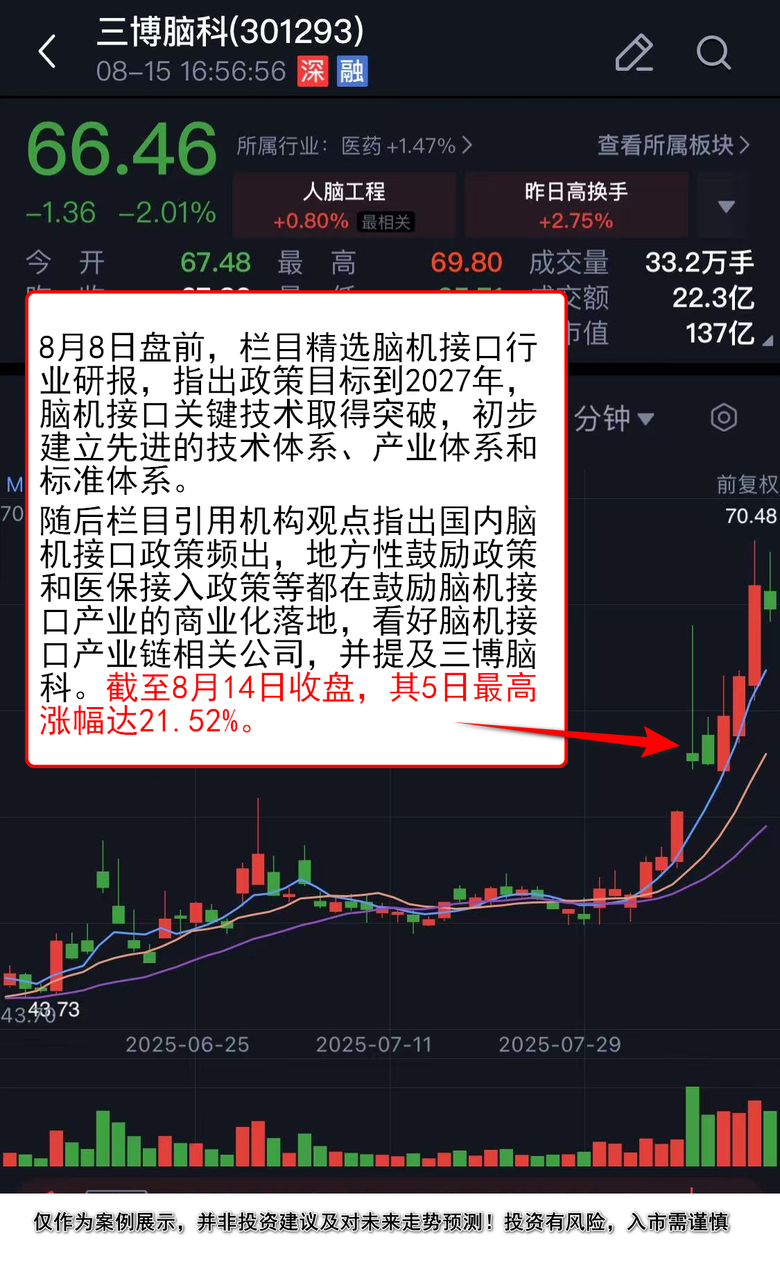 随后栏目引用机构观点指出国内脑机接口政策频出,地方性鼓励政策和医保接入政策等都在鼓励脑机接口产业的商业化落地,看好脑机接口产业链相关公司,并提及三博脑科。截至8月14日收盘,其5日最高涨幅达21.52%。爱朋医疗、翔宇医疗区间最高涨幅皆超10%。