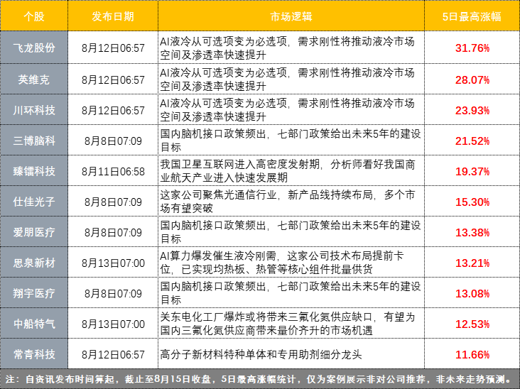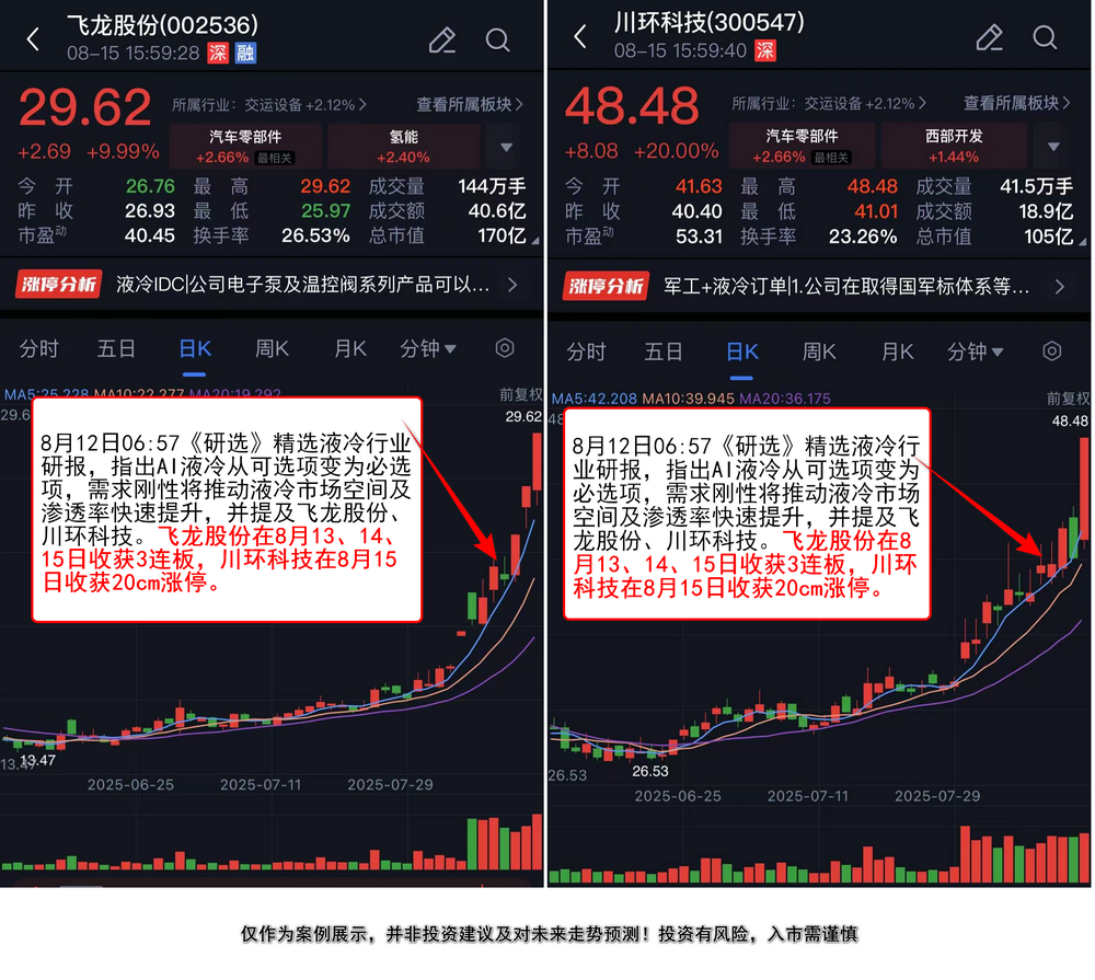 同时,栏目还引用东方证券分析师观点,提出随着智算芯片及机柜功率密度提升、海外厂商ASIC布局加速、国产算力集群规模提升,预计液冷市场将有望迎来快速扩张,液冷产业链将有望借机进入海外供应链,AI液冷将为产业链公司提供第二增长曲线,并提及飞龙股份、川环科技。飞龙股份在8月13、14、15日收获3连板,川环科技在8月15日收获20cm涨停。