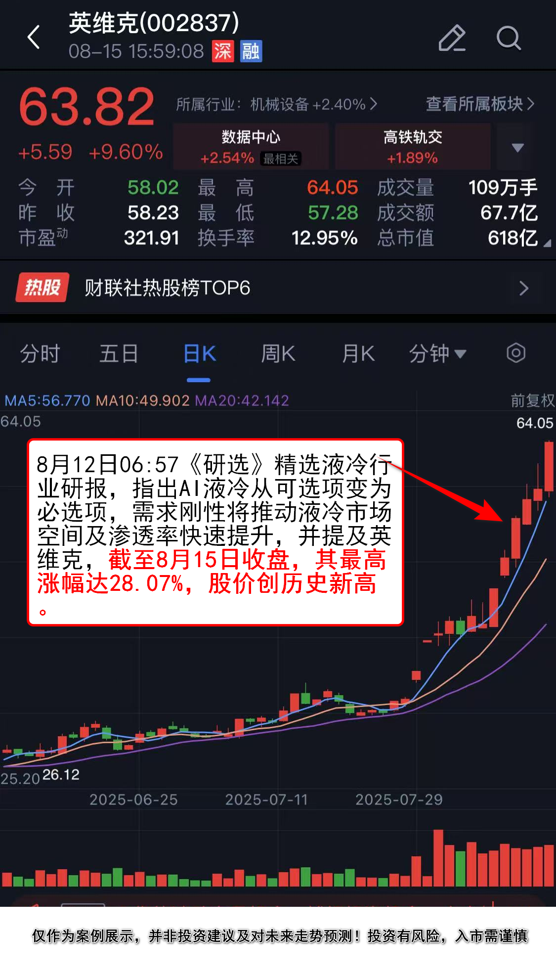 8月12日盘前,栏目精选液冷行业研报,指出以往的海外液冷产业链供应商主要为台系和美系公司,国内厂商难以进入海外液冷产业链;随着海外AI服务器出货量提升,海外液冷供应商产能难以满足日益增长的液冷需求;而国内供应商在产品质量、技术、服务等方面持续提升,逐步取得海外市场认可,如英维克等已进入英伟达供应链体系。截至8月15日收盘,其最高涨幅达28.07%,股价创历史新高。