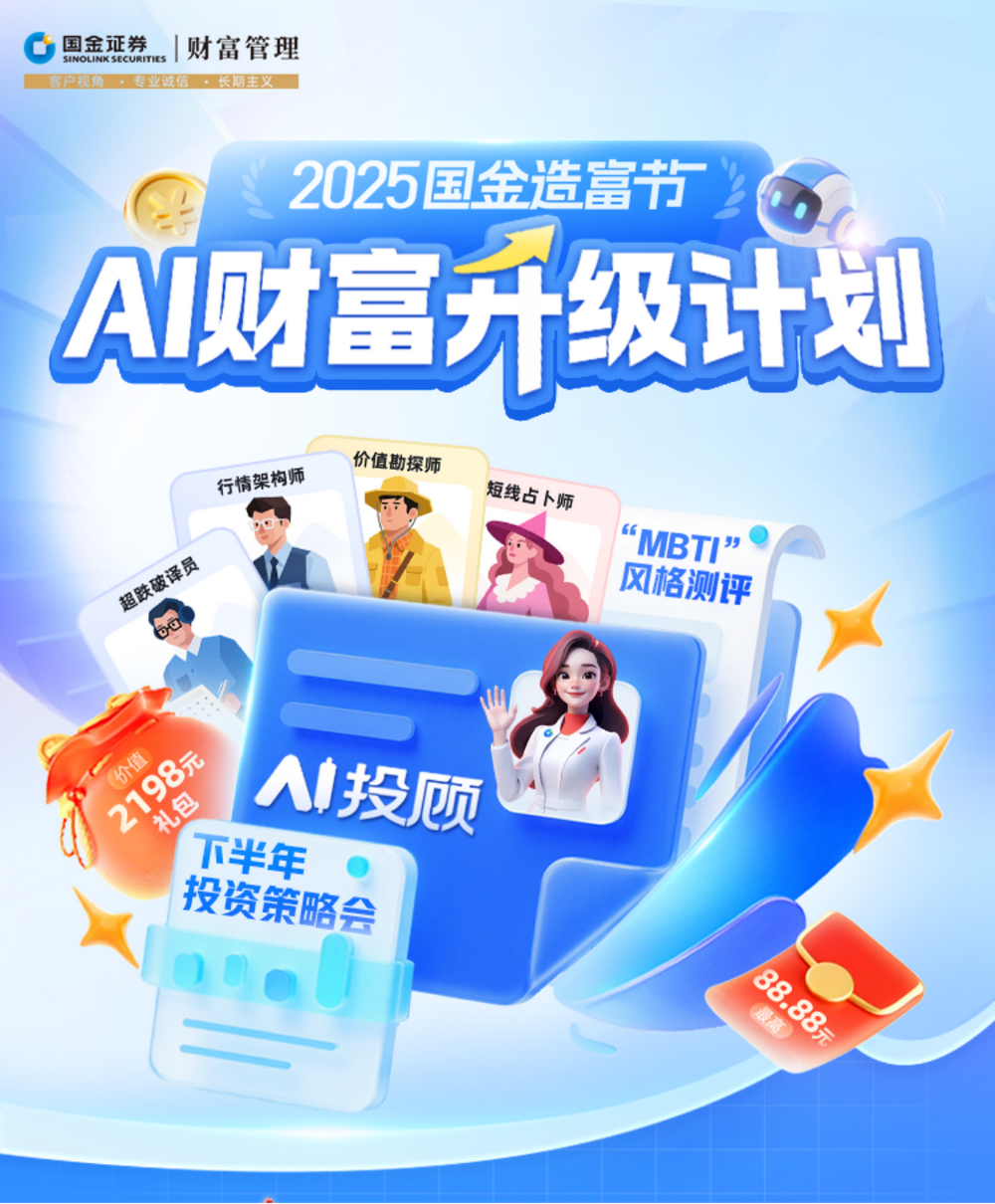 国金证券的活动则是“AI财富升级计划”为主题,将AI贯穿整个活动周期。从活动内容来看,创新推出“国金MBTI”投资风格测评,通过专业的测评,为后续的投资决策提供有力参考。此外,还有全场景智能顾问“国金AI投顾”,围绕选股、选基、持股优化等关键投资场景,基于投资者的历史交易数据、市场动态以及宏观经济指标,运用大数据分析和机器学习算法,为投资者提供更高效的投资建议和调仓换股方案。