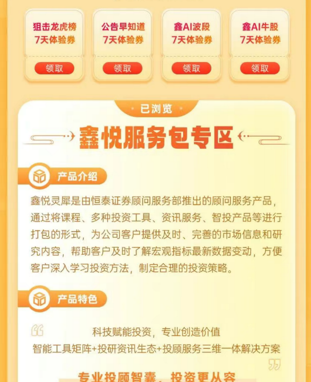 恒泰证券则是在活动福利中聚焦AI投顾的推广,记者注意到恒泰证券在给投资者设置的体验券中,包含“鑫AI波段7天体验券”和“鑫AI牛股7天体验券”。