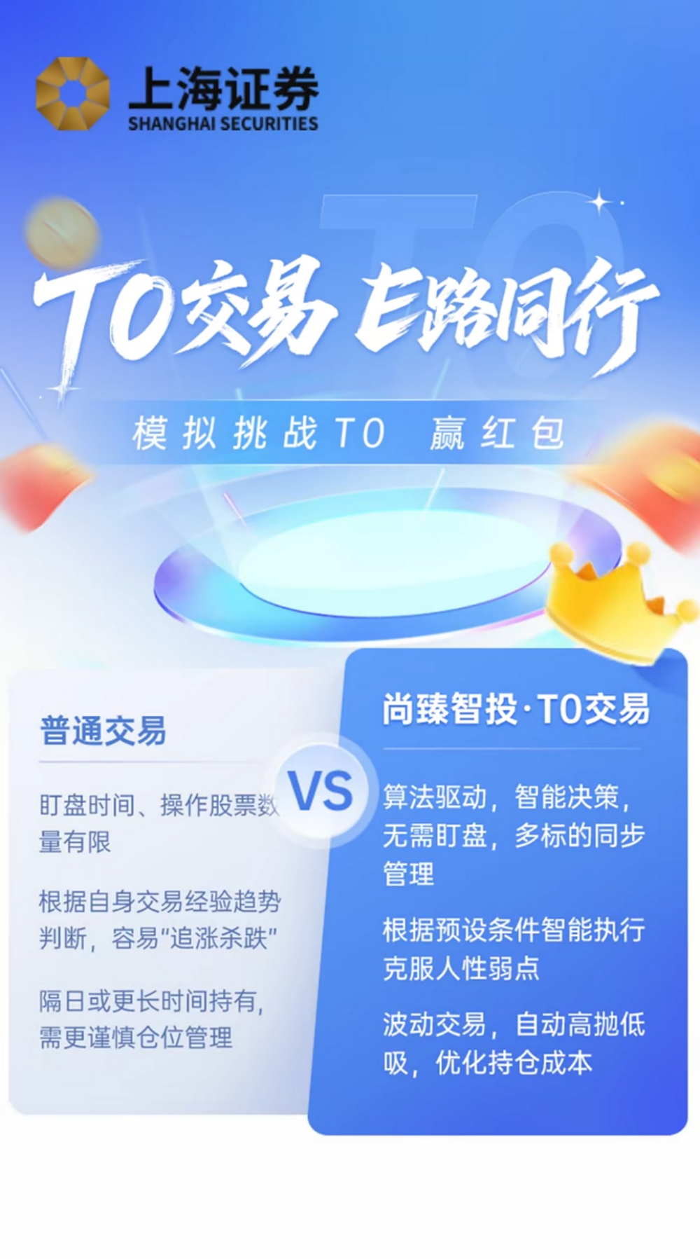 上海证券推出“尚臻智投·T0交易”,基于客户原有的股票持仓,针对同一标的,使用智能T0算法预测未来短期股价走势、盘中智能监控行情以在合适时机发出交易指令,触发T0策略自动完成高抛低吸,抓取行情波动价差以获取风险可控的收益。