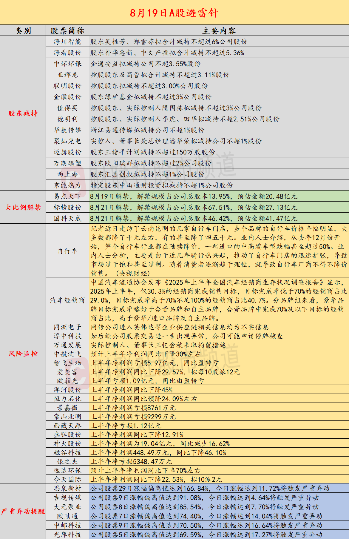 导读:财联社8月19日投资避雷针,近日,A股及海外市场潜在风险事件如下。国内经济信息方面包括:1)中高端自行车出现腰斩价;2)中国汽车流通协会报告显示,上半年完成销售目标的经销商占比仅三成;公司方面重点关注包括:1)6天5板同洲电子公告,网传公司进入英伟达等企业供应链相关信息均为不实信息;2)淳中科技表示,如后续公司股票交易进一步出现异常,公司可能申请停牌核查;海外市场重点关注包括:1)美股三大指数几乎平收,英特尔结束六连涨;2)中国、马来西亚和韩国游客减少,泰国旅游业放缓。