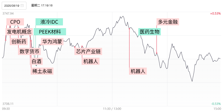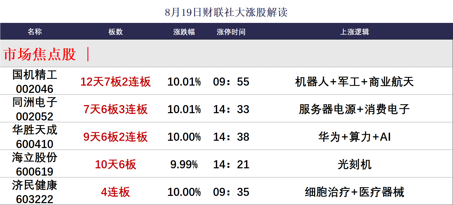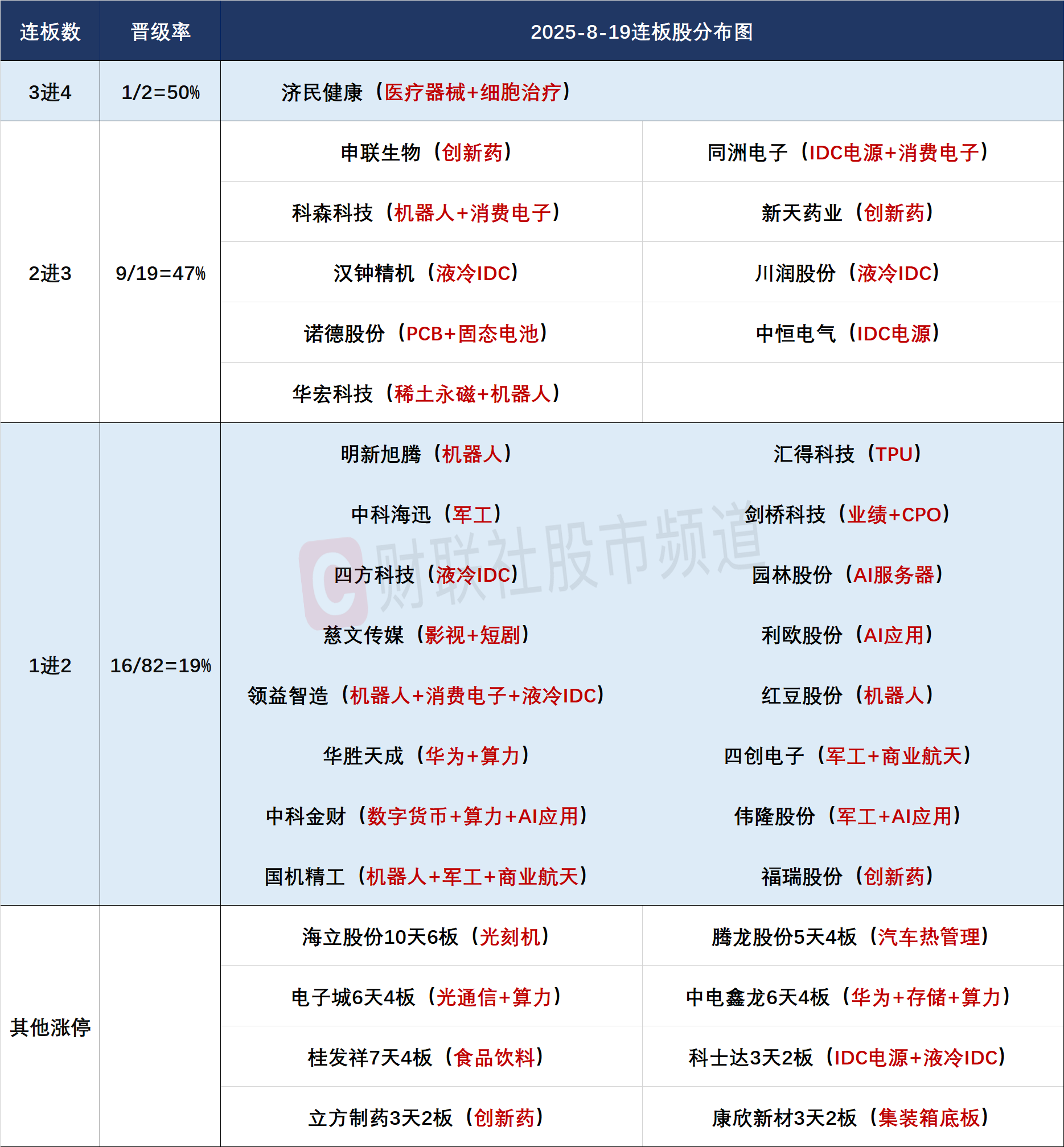 财联社8月19日讯,今日85股涨停,35股炸板,封板率为71%,济民健康4连板,申联生物20cm3连板,川润股份、汉钟精机、诺德股份、华宏科技、新天药业、科森科技3连板,福瑞股份20cm2连板,国机精工12天7板,同洲电子7天6板,华胜天成9天6板,海立股份10天6板,腾龙股份5天4板,中电鑫龙、电子城6天4板,中恒电气、桂发祥7天4板。市场全天冲高回落,三大指数微跌。沪深两市全天成交额2.59万亿,较上个交易日缩量1758亿,成交额连续5个交易日超2万亿。盘面上,市场热点较为杂乱,个股涨多跌少,全市场超2900只个股上涨。板块方面,白酒、华为海思、CPO、人形机器人等板块涨幅居前,保险、军工、证券、游戏等板块跌幅居前。截至收盘,沪指跌0.02%,深成指跌0.12%,创业板指跌0.17%。