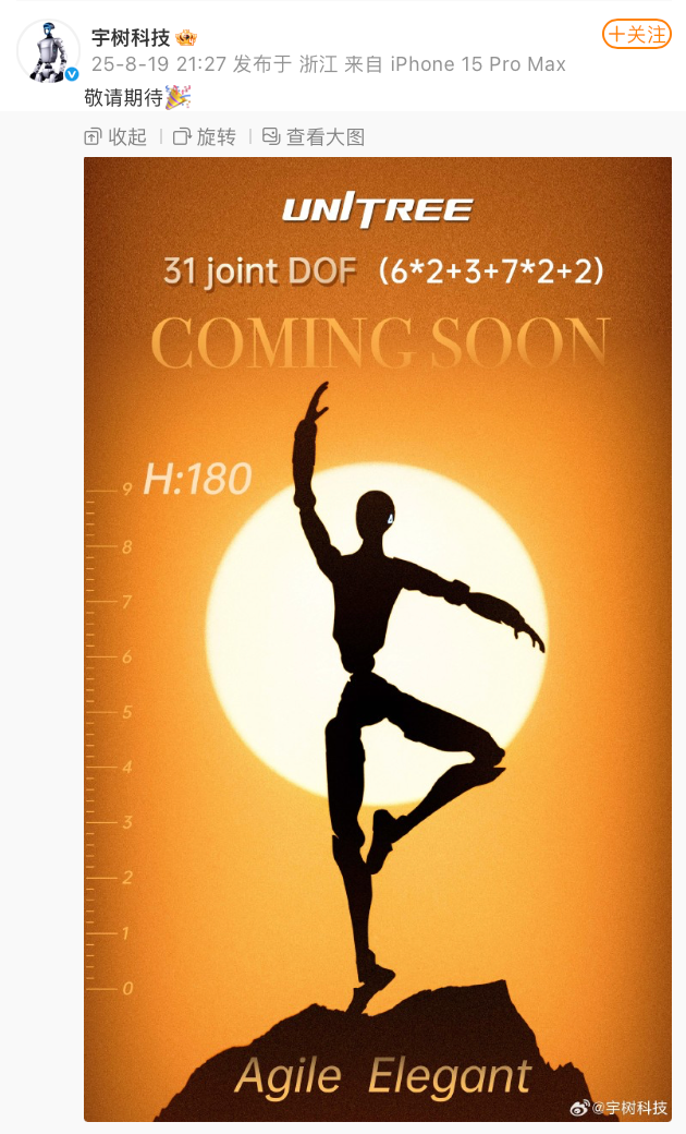 财联社8月19日讯,今日,宇树科技发布新款人形机器人预告海报,配文“敬请期待”。根据官方海报,机器人将配备31个关节(6*2+3+7*2+2)。