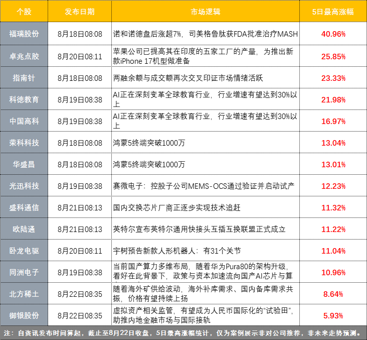 随后栏目指出这个增量资金来源的其中一个可能便是尚未明显入市的居民资金,根据西部证券的统计,当前散户参与度不及去年924行情,距离2015和2020年牛市也有较大差距。同时中信建投证券策略团队也提到,我国居民超额存款规模或达到60万亿元,其中起到决定性因素的便是股票配置偏好的均值回归。本质上就是资金流入——市场上涨——驱动资金进一步流入,而本周正是持续高交易量,带动了市场节节攀升。伴随着情绪高涨,题材板块多面开花,尤其是金融科技方向。栏目追踪行业催化事件,提及多家公司表现强势,下面一起看回顾。