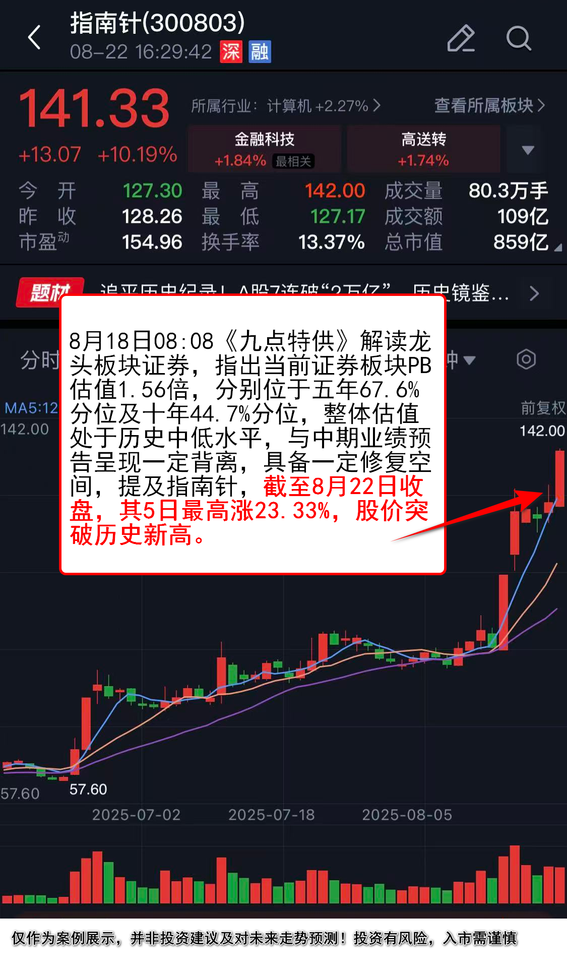 8月18日盘前,栏目解读龙头板块证券,引用机构观点指出,2025年的行情部分延续了2024年下半年的政策驱动逻辑,但核心驱动力或已转向基本面改善+流动性宽松。两融余额与成交额再次交叉印证市场情绪活跃。当前证券板块PB估值1.56倍,分别位于五年67.6%分位及十年44.7%分位,整体估值处于历史中低水平,与中期业绩预告呈现一定背离,具备一定修复空间,并提及长征证券及指南针。长城证券在8月18日收获涨停,指南针大涨,并在本周突破历史新高。