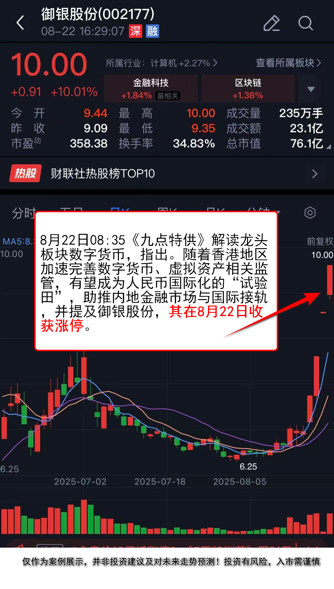 8月22日盘前,栏目解读龙头板块数字货币,追踪到中国工商银行新疆分行通过多边央行数字货币桥平台,为新疆一家港股上市公司办理港股派息支付业务,进一步丰富了新疆数字货币跨境应用场景,引用机构观点指出数字货币影响力已上升至国家战略层面,人民币国际化迎来新机遇,其不仅是加密货币的一种形式,更是大国博弈的金融工具。随着香港地区加速完善数字货币、虚拟资产相关监管,有望成为人民币国际化的“试验田”,助推内地金融市场与国际接轨,并提及御银股份,其在8月22日收获涨停。