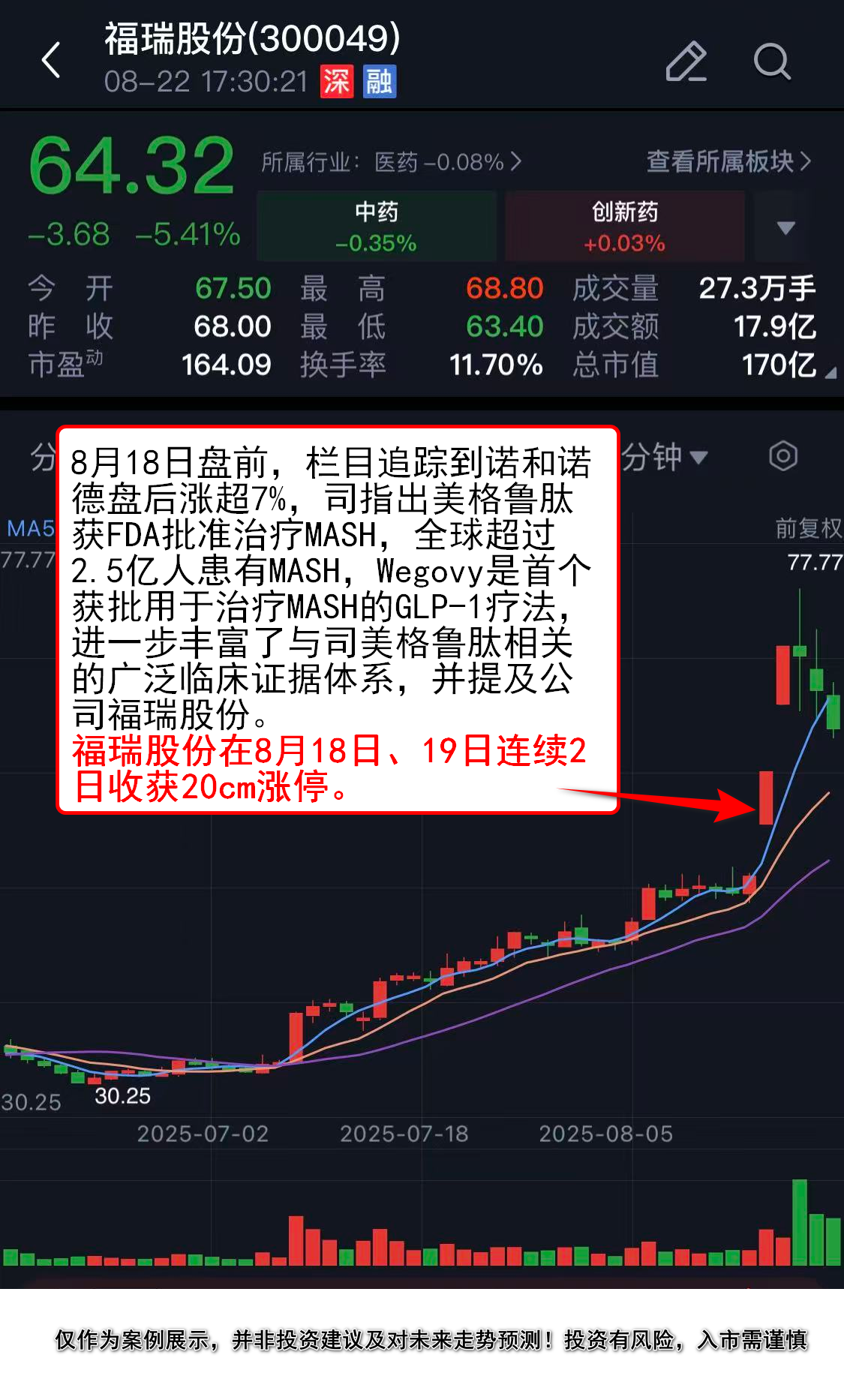 8月18日盘前,栏目追踪到诺和诺德盘后涨超7%,司指出美格鲁肽获FDA批准治疗MASH,全球超过2.5亿人患有MASH,Wegovy是首个获批用于治疗MASH的GLP-1疗法,进一步丰富了与司美格鲁肽相关的广泛临床证据体系,并提及公司福瑞股份。